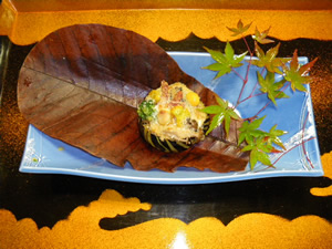 - ②茸と木の実と一緒に炒めあげたものを詰めオーブンで焼き上げる。